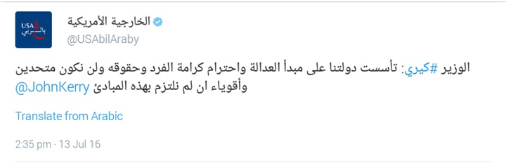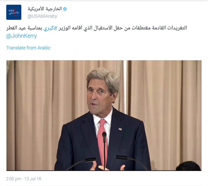 نشرت الخارجية الأمريكية عبر حسابها الرسمي علي موقع التدوينات المصغرة تويتر، مقتطفات بتصريحات وزير الخارجية " جون كيري " التي قالها أمس الثلاثاء في حفل استقبال بمناسبة عيد الفطر في قاعة بنجامين فرانكلين في وزارة الخارجية الأمريكية.