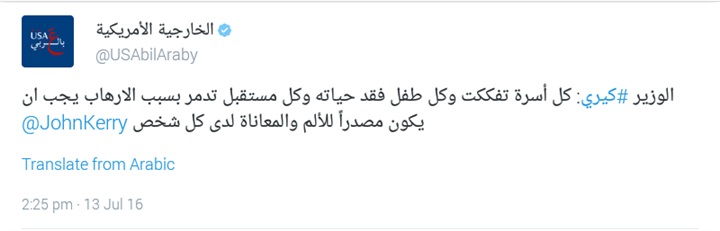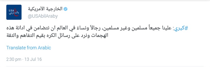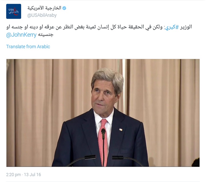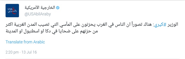 فصرح كيري قائلا:" هناك تصورًا أن الناس في الغرب يحزنون على المآسي التي تصيب المدن الغربية أكثر من حزنهم على ضحايا في دكا أو إسطنبول أو المدينة، ولكن في الحقيقة حياة كل إنسان ثمينة بغض النظر عن عرقه أو دينه أو جنسه أو جنسيته ".