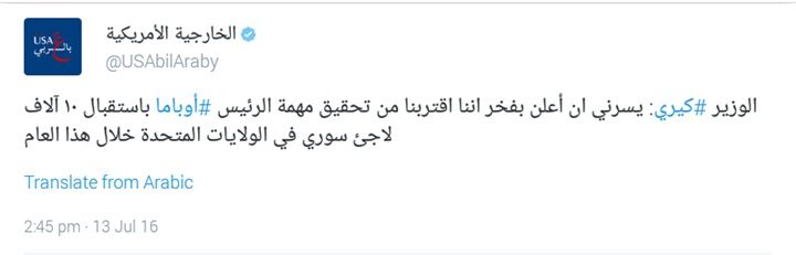وصرح أيضا:" يسرني أن أعلن بفخر إننا اقتربنا من تحقيق مهمة الرئيس أوباما باستقبال ١٠ آلاف لاجئ سوري في الولايات المتحدة خلال هذا العام ".