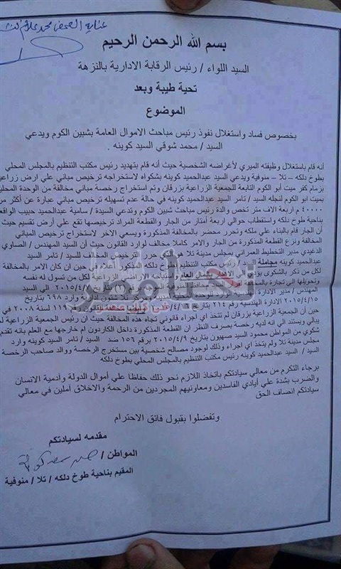 استغل ضابط شرطة بالمنوفية، منصبة وسلطته لمصالحة الشخصية وانه قام بتهديد رئيس مكتب التنظيم بالمجلس المحلي بطوخ دلكة بمركز تلا بمحافظة المنوفية ويدعي السيد عبد الحميد كوينة بشكواة لاستخراج رخصة مباني علي ارض زراعية بزمام كفر ميت ابو الكوم التابعة للجمعية الزراعية بزرقان، وتم استخراج رخصة مباني مخالفة من الوحدة المحلية بميت ابو الكوم لنجلة " تامر السيد عبد الحميد كوينة " في حالة عدم تسهيل رخصة مباني مخالفة عبارة عن 40000 اربع الف متر تخص والدة رئيس مباحث الاموال العامة بالمنوفية وهي سامية عبد الحميد حبيب بناحية طوخ دلكة، واستقطاب اربع امتار من الجار والقطعة المراد ترخيصها.
