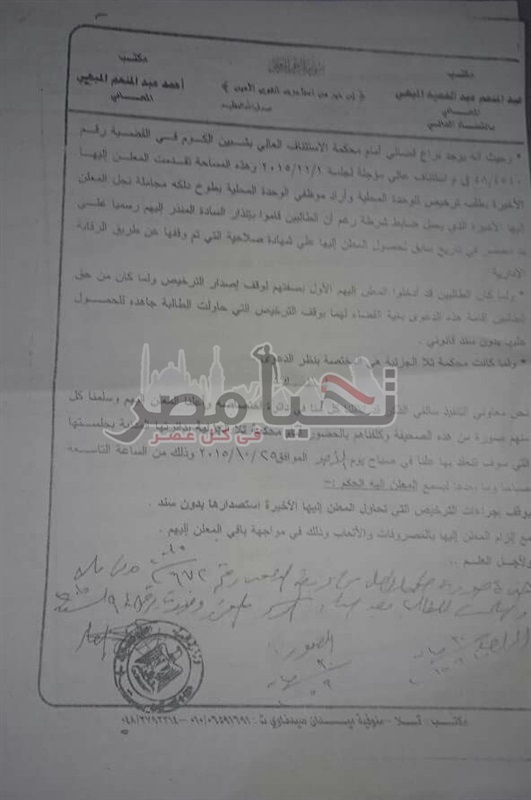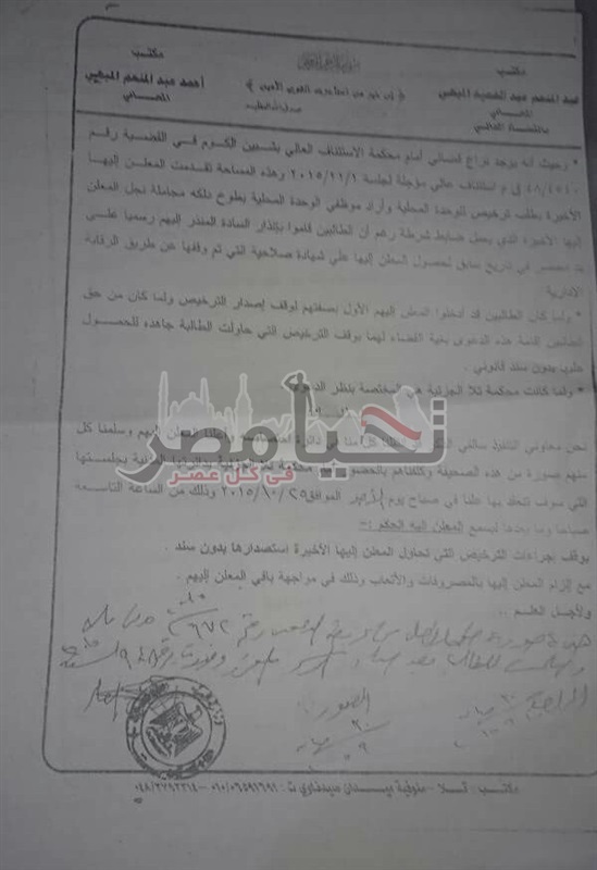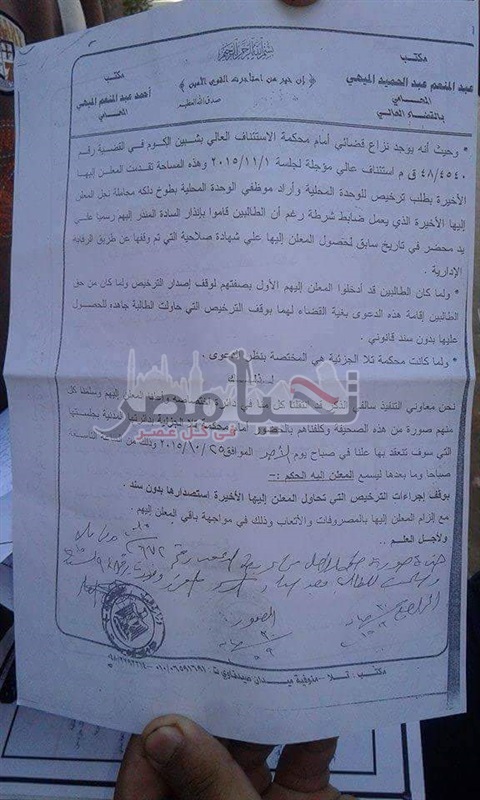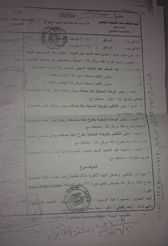 حيث ان رئيس الجمعية الزراعية يبالي ويسند إلى انه لدية رخصة مع العلم بانه تقدم شكوة من المواطن محمود السيد صهيون بتاريخ 9 - 4 - 2014 برقم "156" ضد تامر السيد عبد الحميد كوينة وارد من مجلس مدينة تلا ولم يتم اي اجراء ولذلك لوجود مصالح شخصية بين مستخرج الرخصة ووالد صاحب الرخصة السيد عبد الحميد كوينة رئيس مكتب التنظيم بالمجلس المحلي بطوخ دلكة.